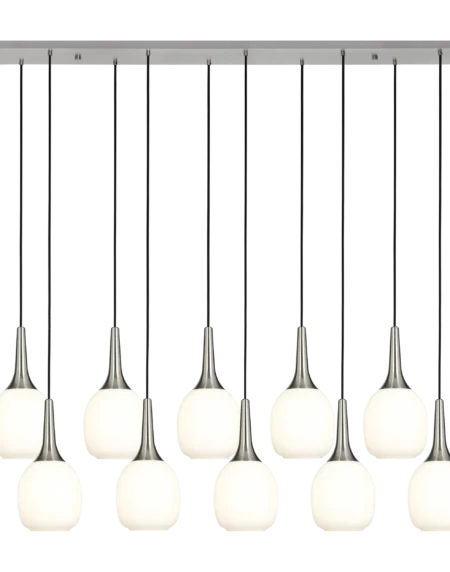Contemporary CAVALLA pendant light with satin nickel steel finish and white matte opal glass shade, featuring five E14 ESL lamps for warm indoor lighting.