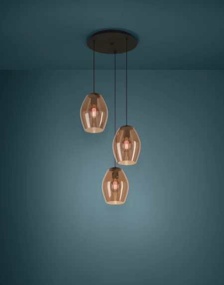 ESTANYS1 3‑Light Pendant Light with Brown‑Transparent Glass Shades, Black Steel Canopy, 45cm Ø × up to 150cm Drop, E27, 2‑Year Warranty