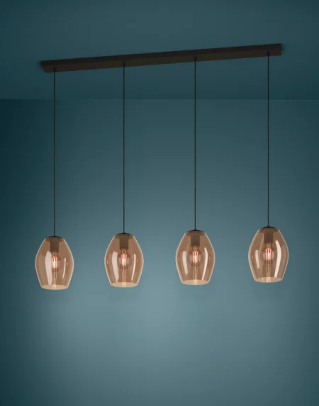 ESTANYS1 4‑Lamp Pendant – Matte Black Steel Canopy 1,240×190mm, 1.5m Adjustable Drop, 4 × E27 Sockets, Brown-Tinted Glass Shades – 2‑Year Warranty