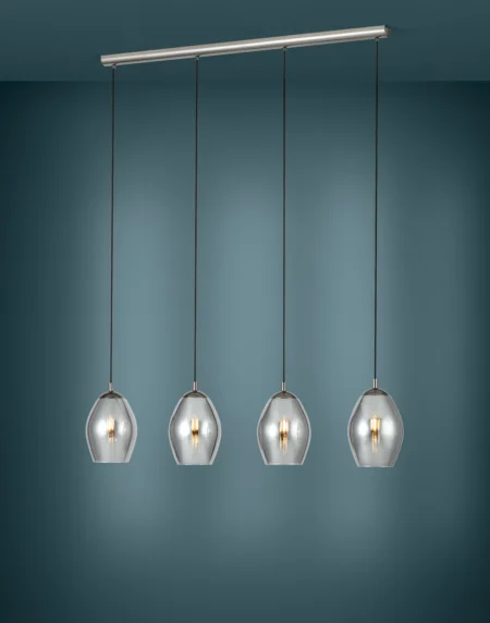 ESTANYS Pendant Light 39566 – Nickel‑Nero Steel with Black-Transparent Vaporized Glass Shades, 4×E27 Sockets (Max4×60W), 1,130mm × 185mm × 1,500mm, IP20 Indoor, 2‑Year Warranty