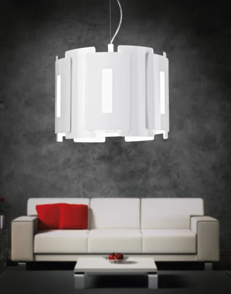 ESTEPOLA 12 pendant light featuring a steel enclosure and white film shade, delivering bright and crisp illumination with an E27 lamp socket.