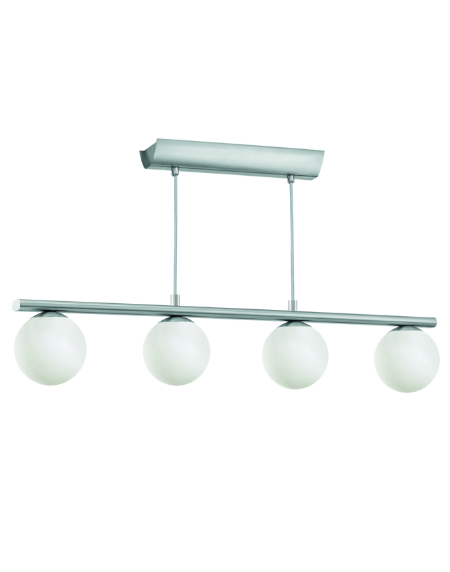 FERROL 12 pendant light with satin nickel steel enclosure and matte opal glass, featuring warm white halogen lamps for a soft indoor glow.