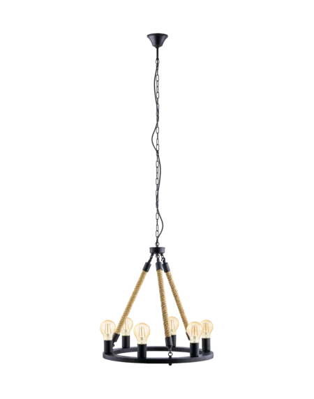 FINDLAY Pendant Light – Black Steel & Rope Suspension – 6×E27 Bulbs – 59″ Adjustable Hanging Cord – Vintage‑Industrial Chandelier – 2‑Year Warranty