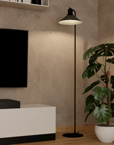 Black steel floor lamp with white plastic shade and in‑line switch, E27 up to 60 W (lamp not included), 1775ר245 mm with Ø225 mm base, Class II.