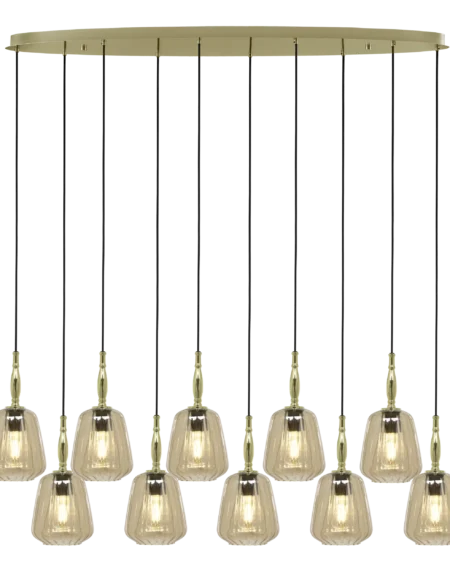 Brass-colored steel and amber glass pendant, black textile cable, 40W E27 illuminant, weighs 1.3 kg.