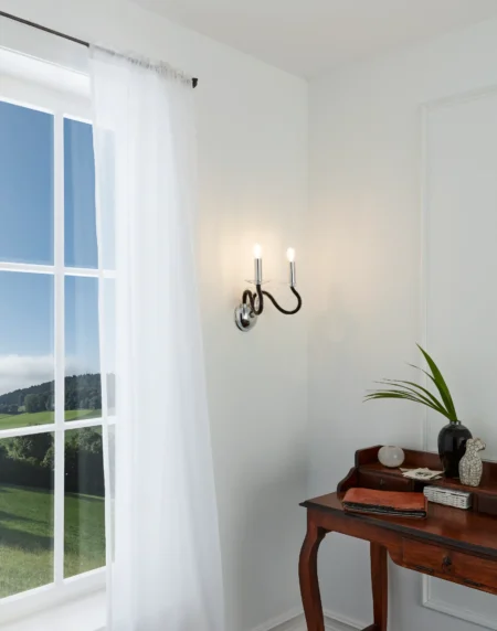 MEDUNO Wall Lamp – Chrome Steel Frame with Black Glass Shade, E14 Socket, 220–24V, 350×270×180mm, IP20, AGL Bulb Compatible, 2‑Year Warranty