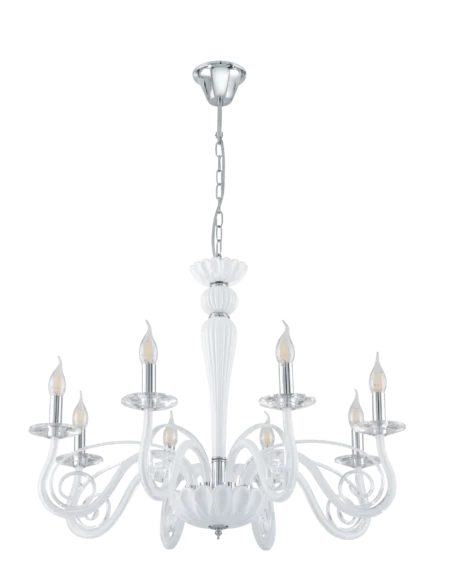 MEDUNO1 8‑Lamp Pendant Chandelier – Chrome Steel Frame with White Glass Shades – E14 Base, 8×40W – 76cm Dia × 120cm H – Elegant Indoor Ceiling Lamp