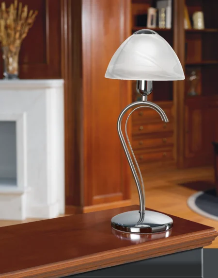 Satin‑nickel/chrome table lamp with white alabaster glass, E14 up to 60 W (lamp not included), in‑line switch, 430ר170 mm, IP20 Class II.