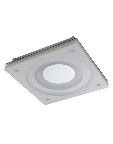 Square ceiling lamp in satin nickel with white satin‑glass and mirrored accents, delivering warm‑white 2700 K light from an included 2GX13 T5 ring, IP20 indoor.
