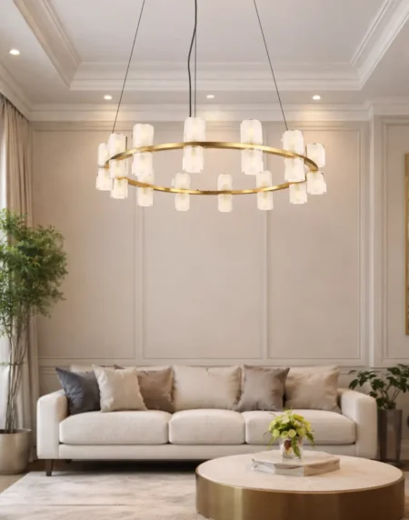 LINUS Pendant Light – 4×E14 Antique Brass Chandelier with Opal Glass Shades
