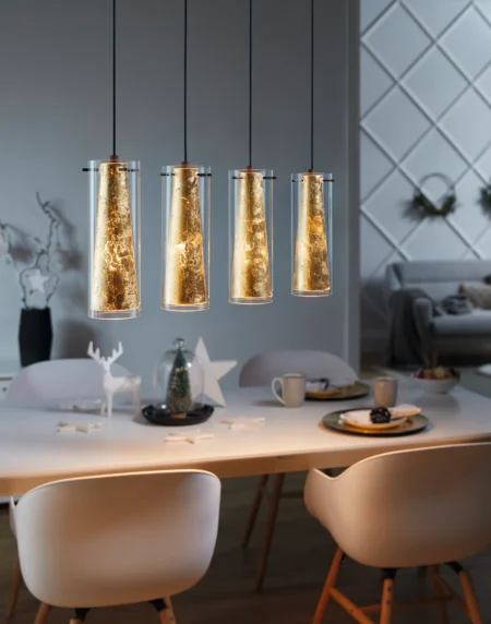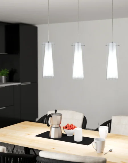 The PINTO pendant light is a stylish and sophisticated lighting fixture featuring a chrome steel enclosure combined with clear and matte opal glass shades. It stands 1500 mm tall with a diameter of 500 mm, serving as a striking centerpiece in modern indoor spaces such as dining rooms, kitchens, or