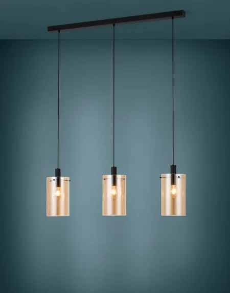 POLVERARA 3‑Lamp Pendant – Black Steel with Amber-Colored Vaporized Glass Shades, 3×E27 Sockets (Max 3×40W), 1,150×180×1,500mm, 220–240V, IP20, 2‑Year Warranty