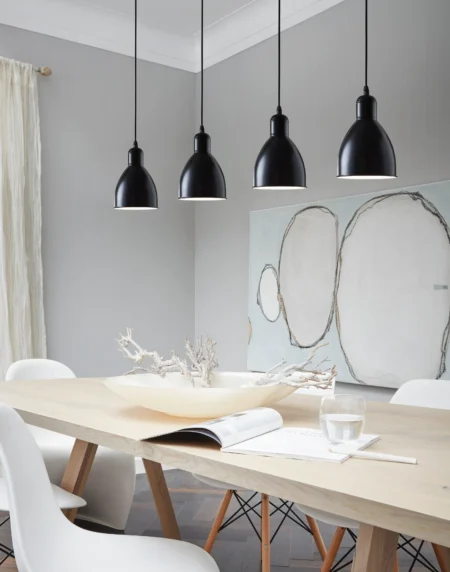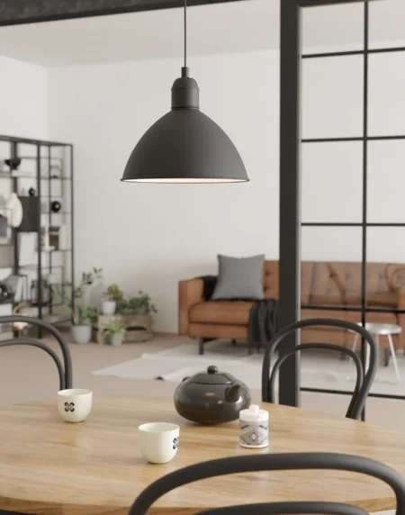A wide-format black pendant light designed to deliver strong visual impact and ambient illumination in spacious interiors.