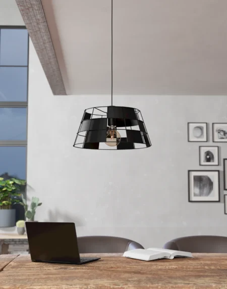 PONTEFRACT Pendant Light – Black Steel Cage – 1×E27 Socket – Ø42cm × Height110cm – IP20 – Vintage Industrial‑Geometric Design