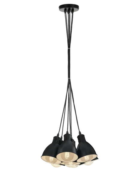 PRODDY 7‑Light Pendant – Black Steel Cluster with White Interior – E27 Sockets – 43″ Adjustable Suspension – Industrial‑Vintage Statement Lighting – 2‑Year Warranty