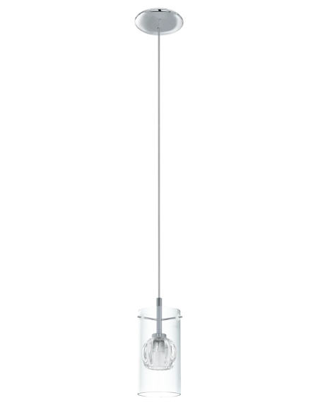 RICABO pendant light with chrome steel enclosure and clear satin glass shade, housing a 33W halogen lamp for warm lighting.