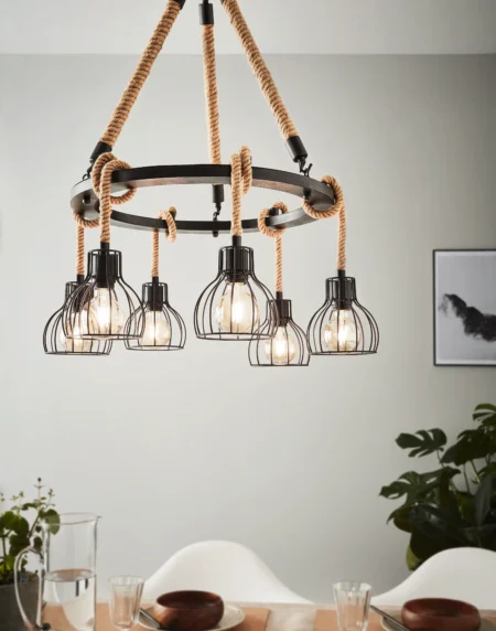 RAMPSIDE 43194 6‑Light Pendant – Industrial Vintage Black Steel & Hemp Rope, 6×E27 Sockets (Max 28W, Bulbs Not Included), Ø76cm, Adjustable Drop to 1.09m, IP20, 2‑Year Warranty