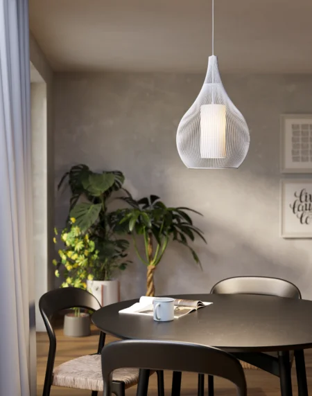 RAZONI 1-Light Mini Pendant – White Satin Glass & Steel Teardrop Shade, E27 Socket, Adjustable 130cm Drop