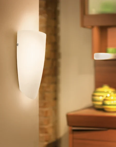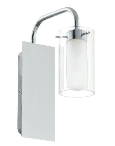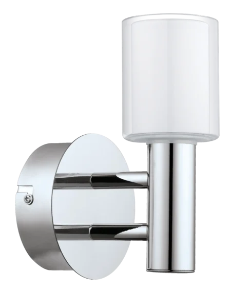 The Palermo 94993 is a sleek indoor wall light designed for bath areas, featuring a chrome steel enclosure with a white and clear glass shade. It provides warm white LED illumination f