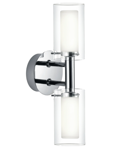 PALERMO indoor bathroom wall light in chrome with white and clear satin glass shades. Features 2 G9 halogen lamps with warm white light. IP44 rated for bathroom moisture protection.