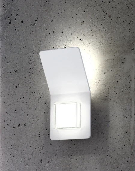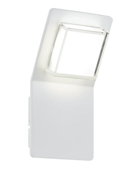 White aluminium outdoor wall light with replaceable LED module, 1×2.5 W included (≈160 lm, 3000 K), 210×110×100 mm, IP44 Class I.