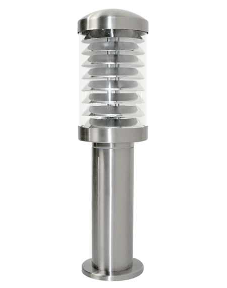 Stainless‑steel pedestal light with clear glass, IP44, includes 1×E27 22 W ESL at 2700 K warm white; 460ר125 mm with Ø115 mm base, Class I.