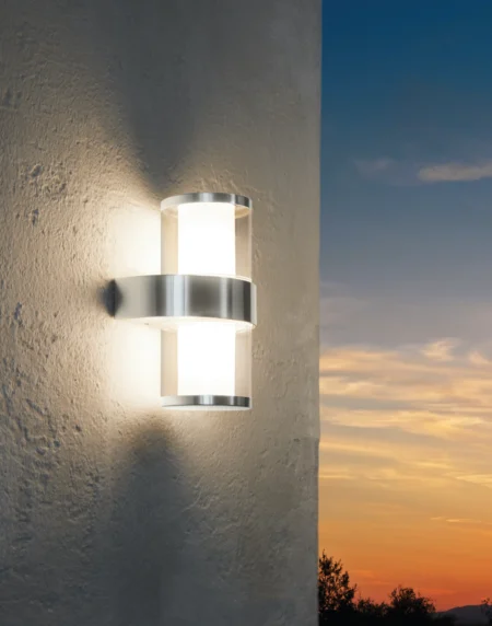 BOSARO94779 Outdoor/Indoor LED Wall Light – IP44 Stainless Steel, 2×2.5W Warm White (3000K), Replaceable LEDs, Corner-Mountable