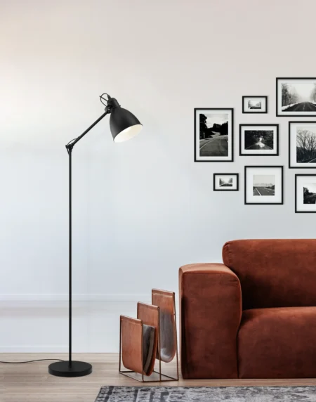 PRODDY Floor Lamp – Matte Black Steel with White Interior Shade – Adjustable Head – E27 Socket – Foot Switch – Industrial Vintage Design – Ideal for Living Room, Bedroom, or Office – 2-Year Warranty