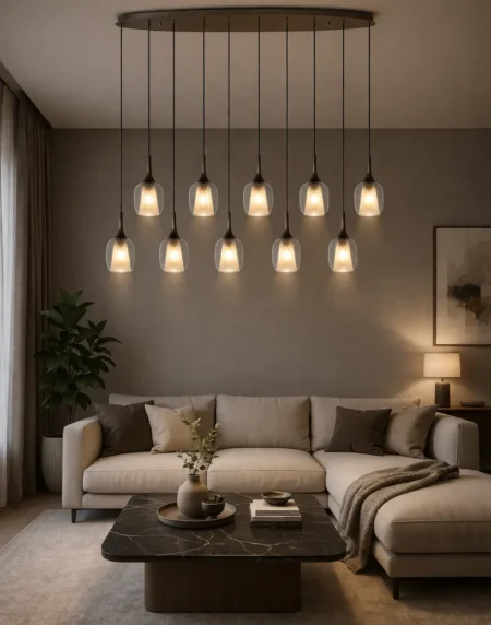 CORNACCHIOLA Pendant Lamp – Steel Dark Bronze Finish with SLamply Black Vaporized Glass, 10 x E27 Bulbs, Max 40W, 1480mm Length, 260mm Width, 1300mm Height