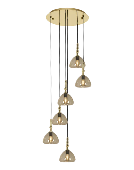 PROSSEDI Pendant Lamp – Shiny Brass Steel Frame with Amber Glass Shades, 6 x E27 Bulbs Compatible, Max 40W, 1700mm Height, 500mm Diameter