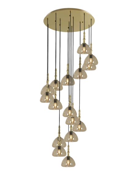 PROSSEDI Pendant Lamp – 300 cm Height x 78 cm Diameter – 16 x E27 Sockets – 40W Max per Bulb – Brass Shiny Steel – Amber Glass – Large Decorative Indoor Fixture