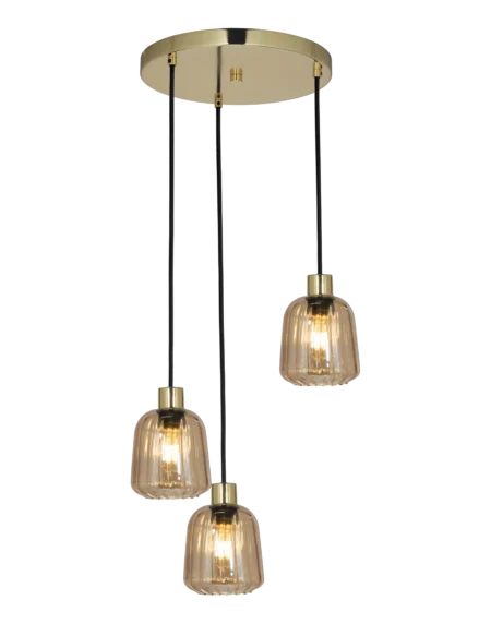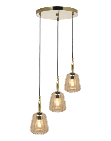 GIOIELLA Pendant Light – Steel & Shiny Brass Ceiling Lamp with Amber Glass Shade, 3 x E27 Bulbs Compatible, 40W Max, 1500mm Height, 300mm Diameter
