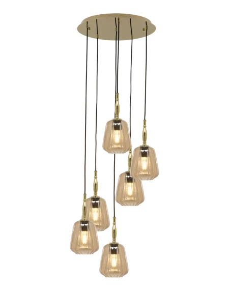 GIOIELLA Pendant Lamp – Shiny Brass Steel Frame with Amber Glass Shades, 6 x E27 Bulbs Compatible, Max 40W, 1700mm Height, 500mm Diameter