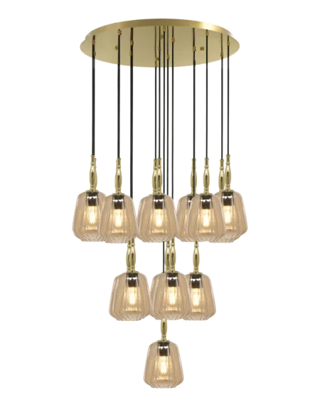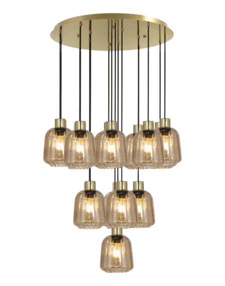 GIOIELLA Pendant Lamp – 170 cm Height x 78 cm Diameter – 16 x E27 Sockets – 40W Max per Bulb – Shiny Brass Steel Frame – Amber Glass Shade – Elegant Indoor Lamping
