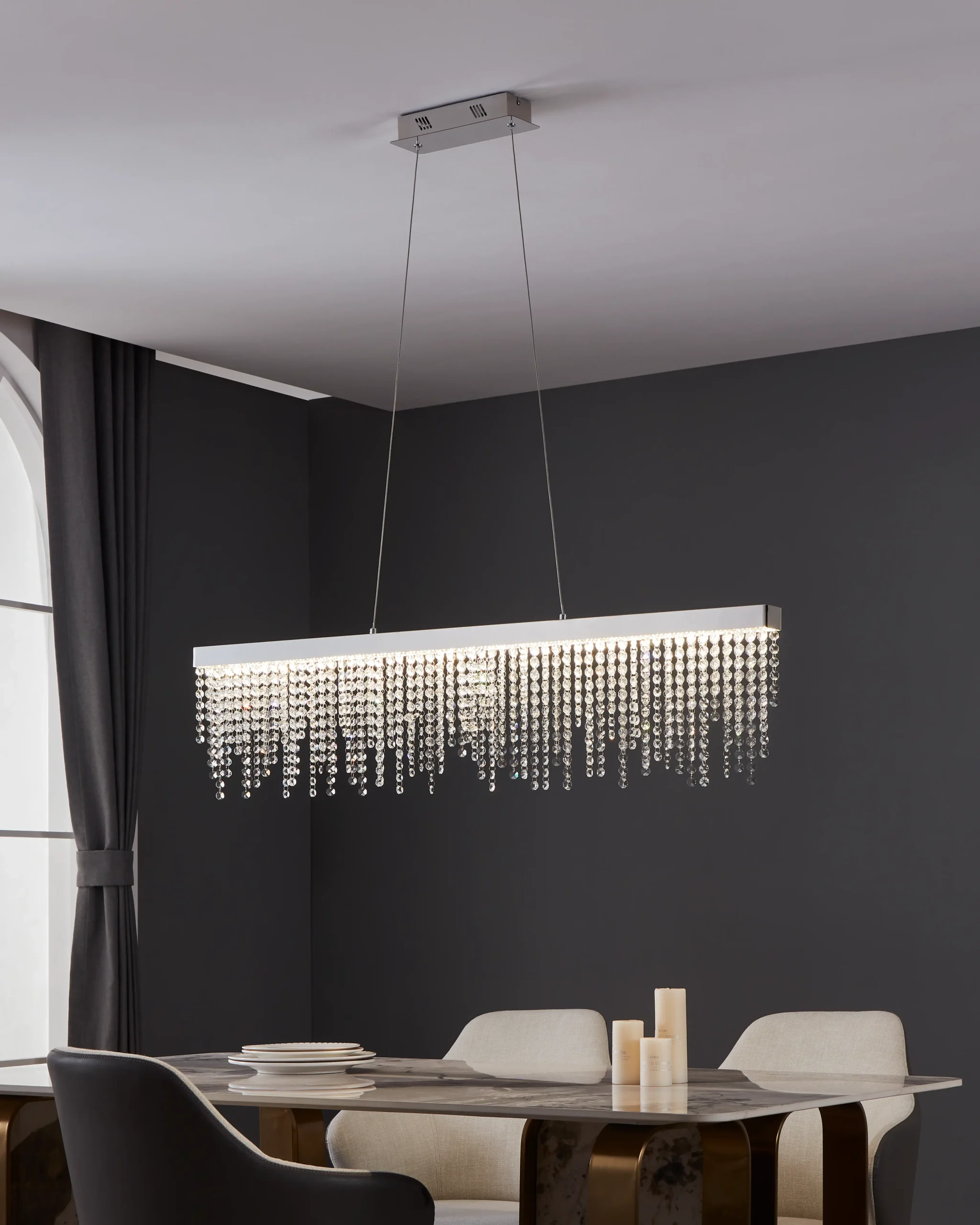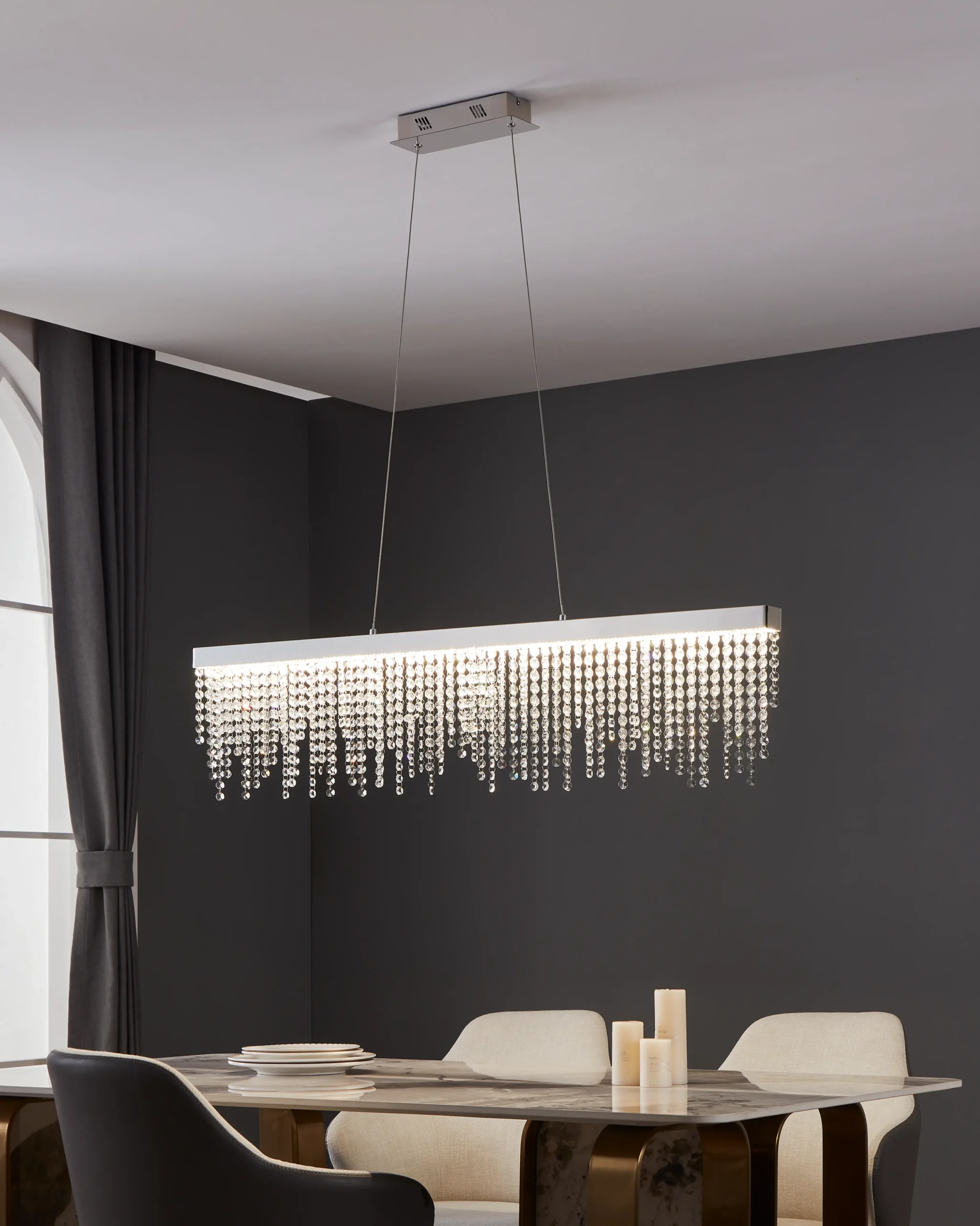Sleek Linear Profile: At 1,150mm long × 90mm wide, with adjustable suspension up to 1,500mm drop, its slim form makes it ideal for placing over kitchen islands or dining tables, without overwhelming the space .