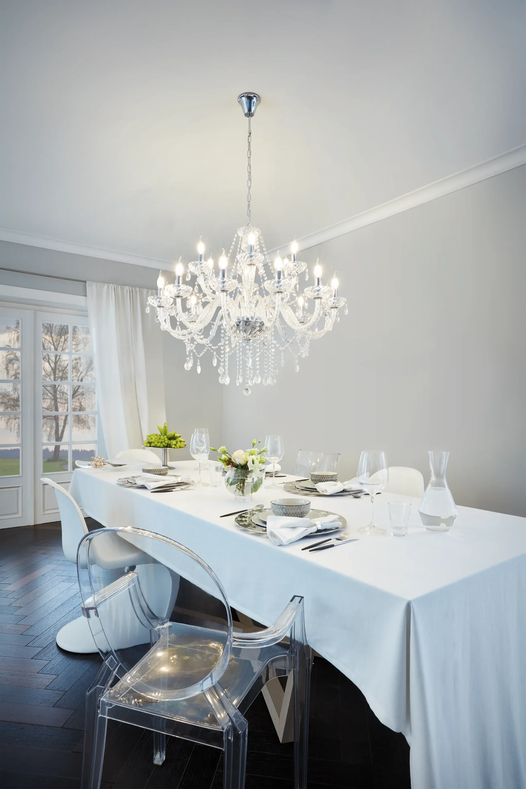 Premium materials & craftsmanship – High-quality chrome-plated steel structure with elegant clear glass components and crystal-like effect.