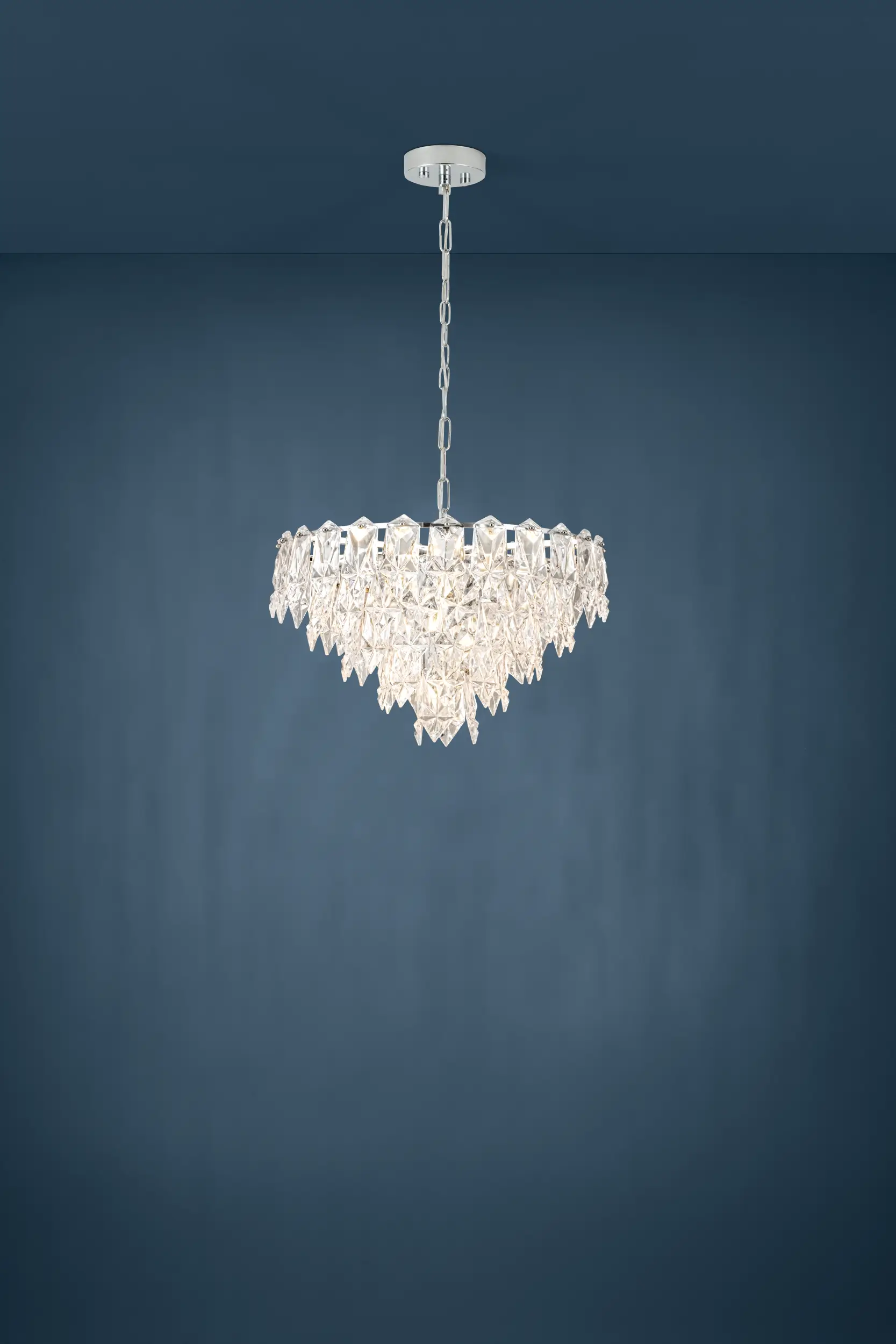 Elegant Crystal Cluster Design: Features rows of pointed clear glass pieces, creating a cascading, crystal-like appearance suspended from a polished chrome steel canopy—adds a luxurious, sparkling ambiance to interiors.
