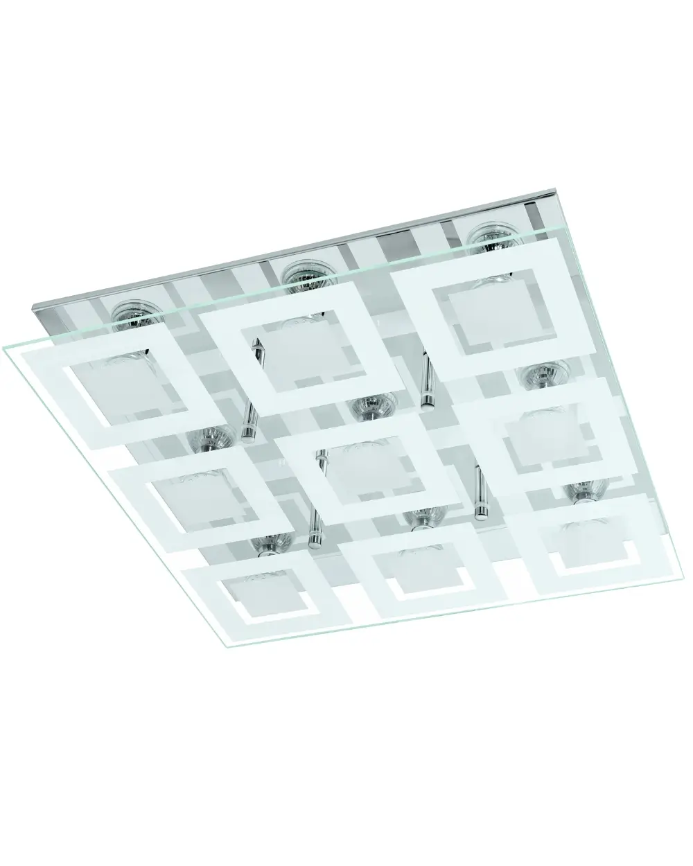 Sleek contemporary design – Polished chrome and satin glass housing offers a modern aesthetic in an eye‑catching 47×47cm flush‑mount form .