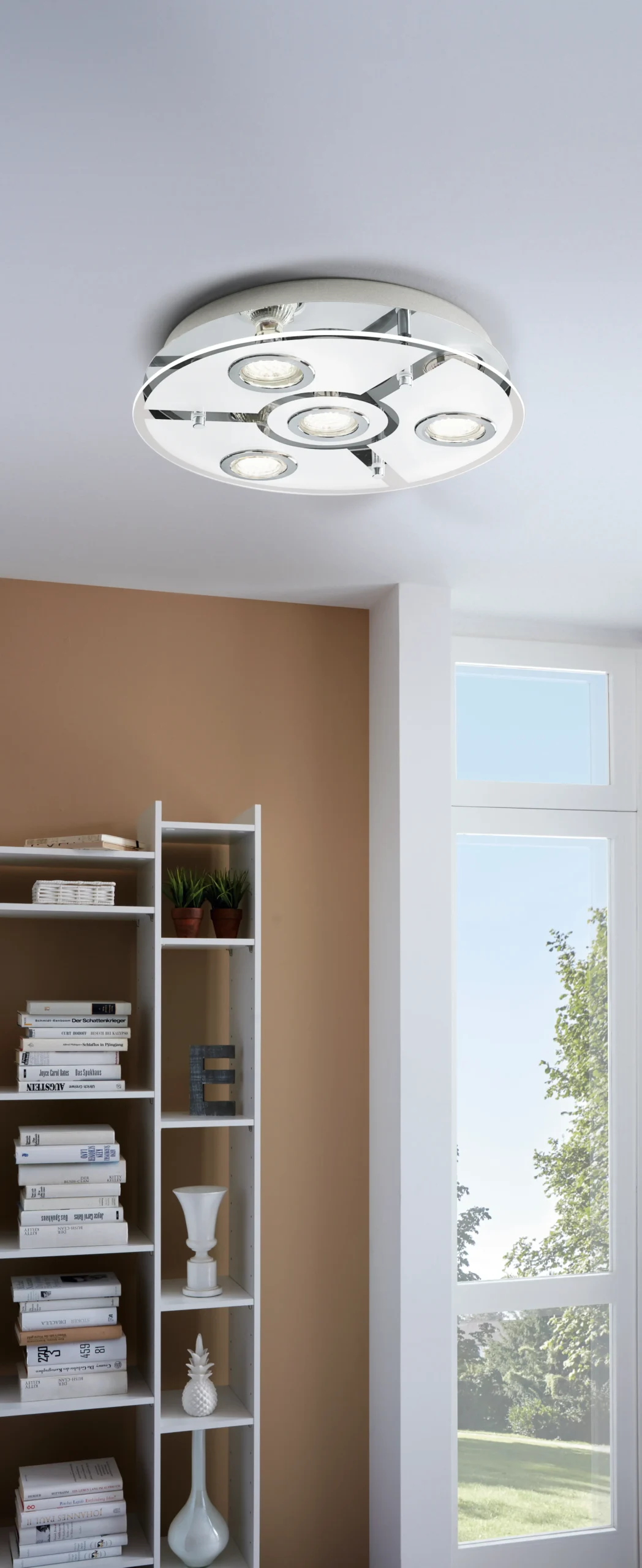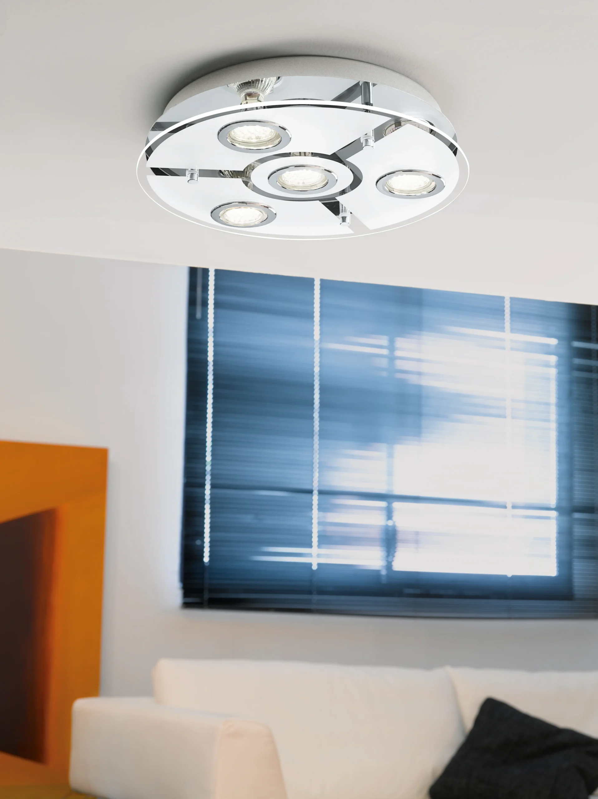 The EGLO CABO 93107 is a low-profile ceiling lamp featuring a chrome stainless-steel enclosure paired with white/clear satin glass for soft, glare-controlled illumination. It includes 4x GU10 LED lamps at 3 W each (included), producing 240 lm per lamp at 3000 K warm white for comfortable everyday lighting. With a compact 350 mm diameter and 75 mm height, IP20 rating, and Class I safety at 220–240 V, it’s well suited to living areas, bedrooms, and corridors.