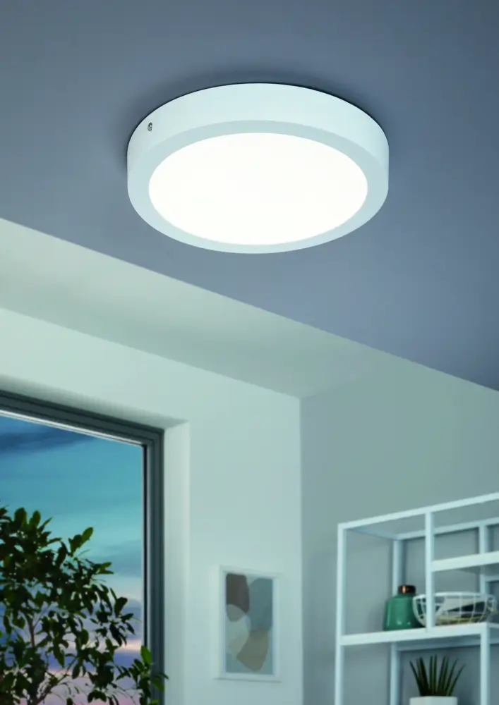 The EGLO FUEVA 1 94536 is a sleek, flush-mount ceiling lamp in white cast metal with a white plastic diffuser for bright, uniform illumination. It integrates a non-replaceable 24 W LED producing 2600 lm at 4000 K neutral white (1860 lm with cover), EEI class F, non-dimmable, with 25,000 h lifetime and 15,000 switching cycles. Measuring 300 mm in diameter and only 40 mm high with IP20 protection and Class II insulation on 220–240 V, it offers a minimal, unobtrusive ceiling solution.