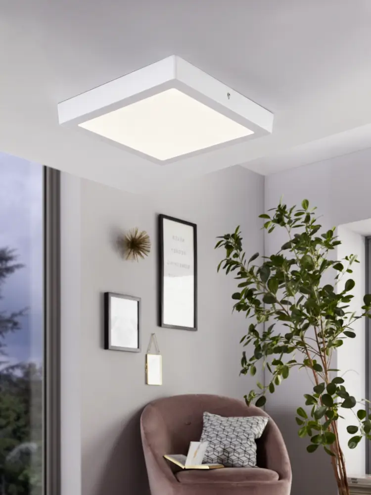 The EGLO FUEVA 1 94537 is a flush-mount ceiling lamp in white cast metal with a white diffuser, designed for bright, uniform indoor lighting. It integrates a non-replaceable 22 W LED producing 2600 lm at 3000 K warm white (1840 lm with cover), EEI class F, non-dimmable, with 25,000 h lifetime and 15,000 switching cycles. With a compact 300 x 300 mm form and just 40 mm height, IP20 rating, and Class II insulation for 220–240 V, it offers a clean, unobtrusive ceiling solution.