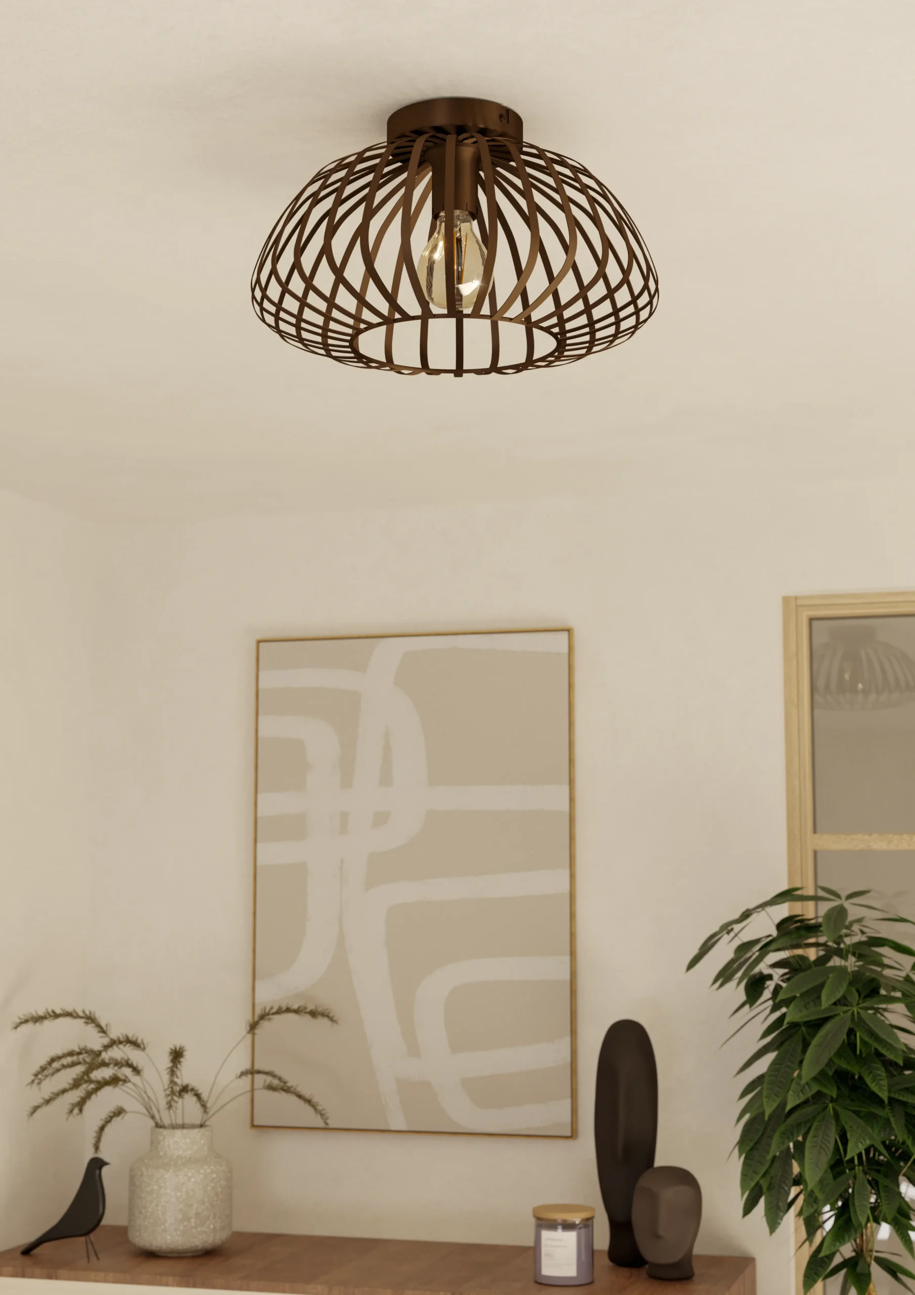 Striking bronze steel cage design – Features an openwork cage in a rich bronze finish, ideal for living rooms, kitchens, hallways, or bedrooms, casting a warm and stylish lighting pattern .