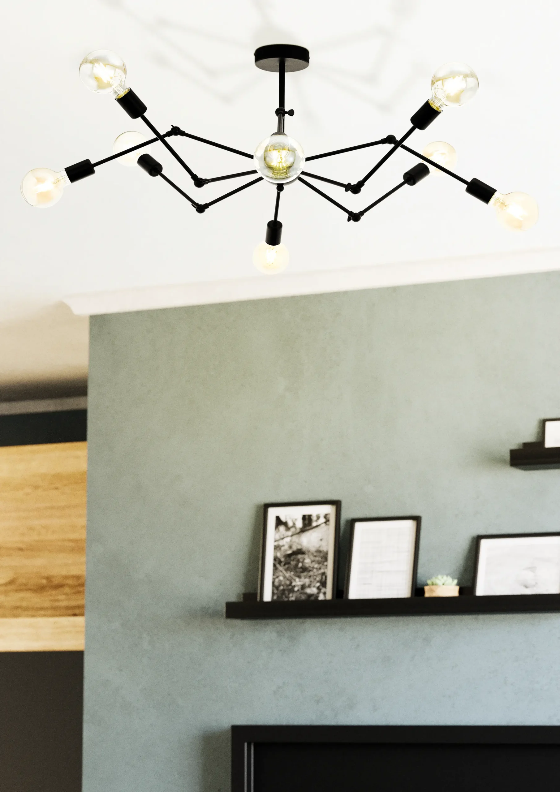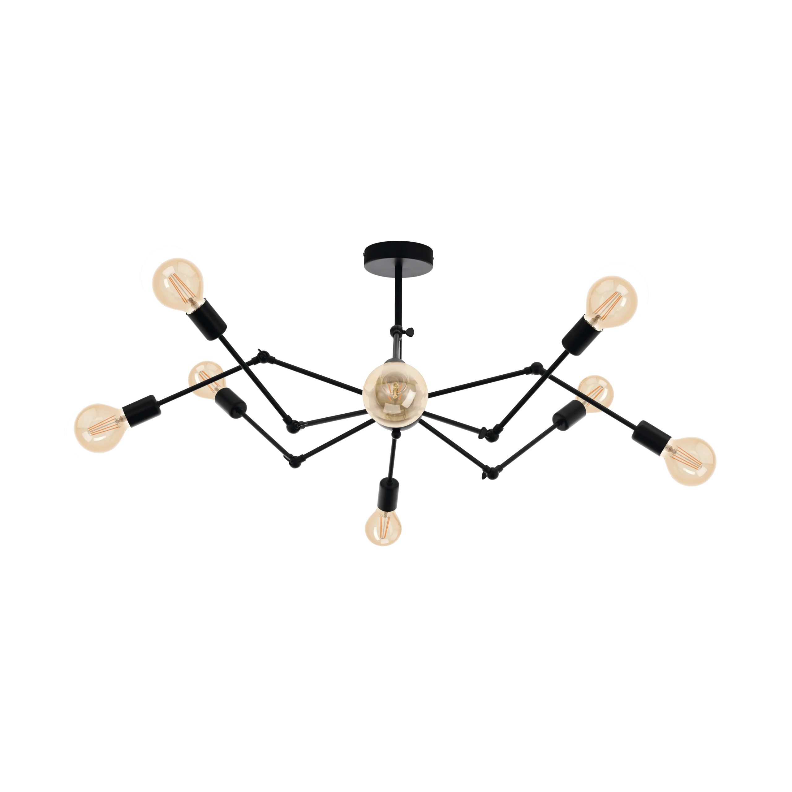 Design & Style: A bold vintage-industrial ceiling fixture featuring eight adjustable Black Steel arms radiating from a central hub—reminiscent of a spider chandelier. Its matte-Black finish brings a striking sculptural element to modern interiors.