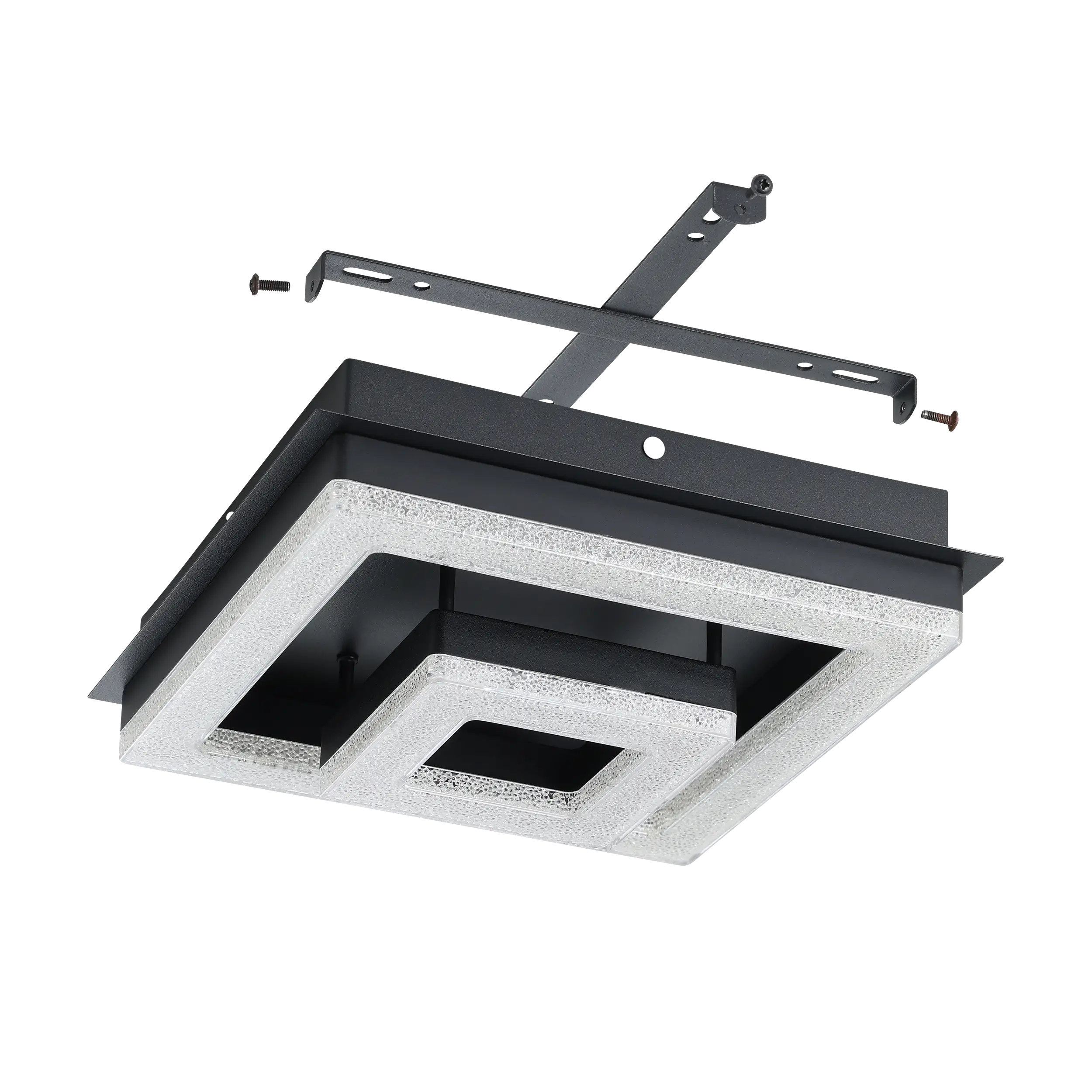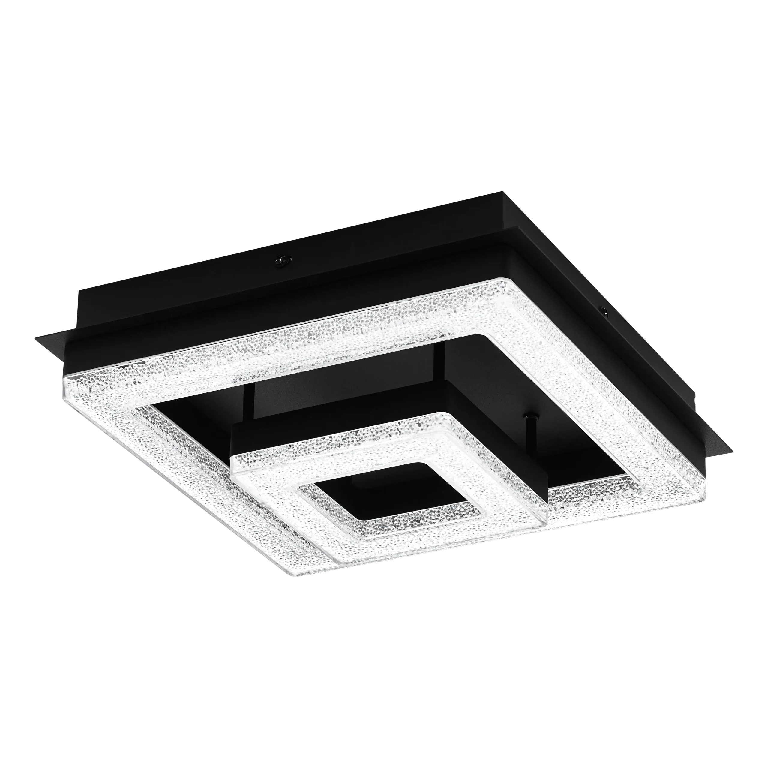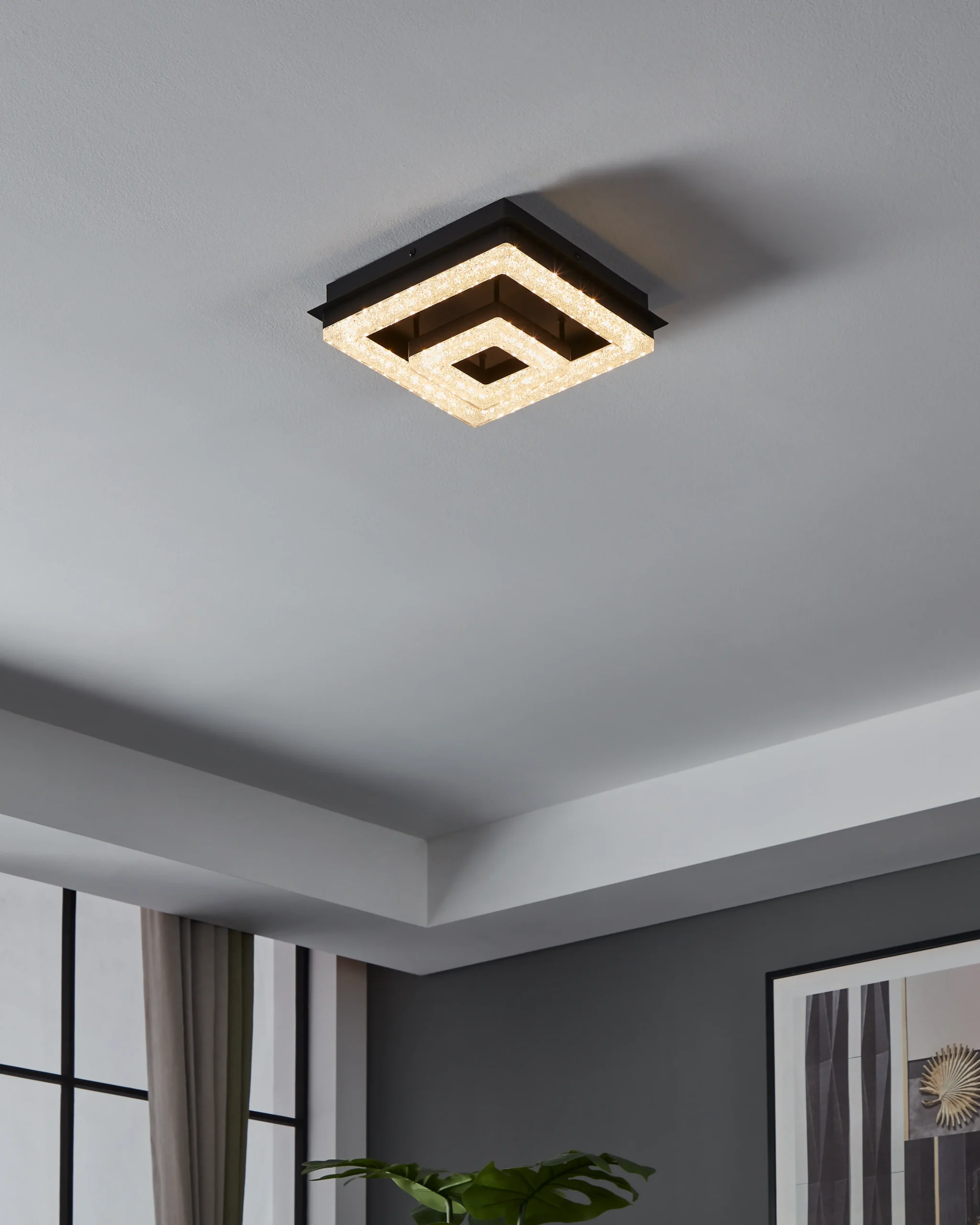 Compact square flush design – Sleek 260×260mm matte-black steel body with sparkling crystal-effect plastic diffusers, blending modern minimalism with subtle glam.