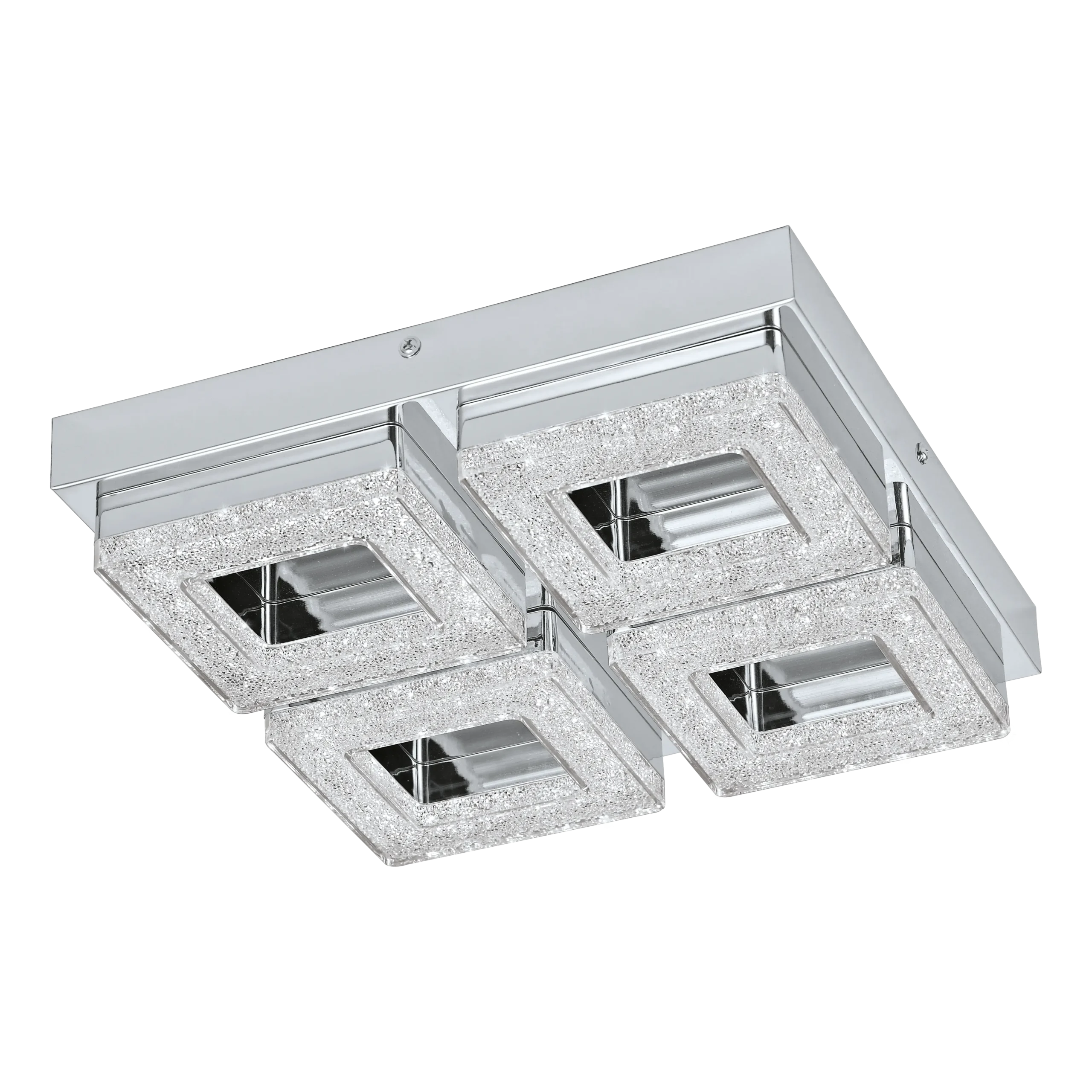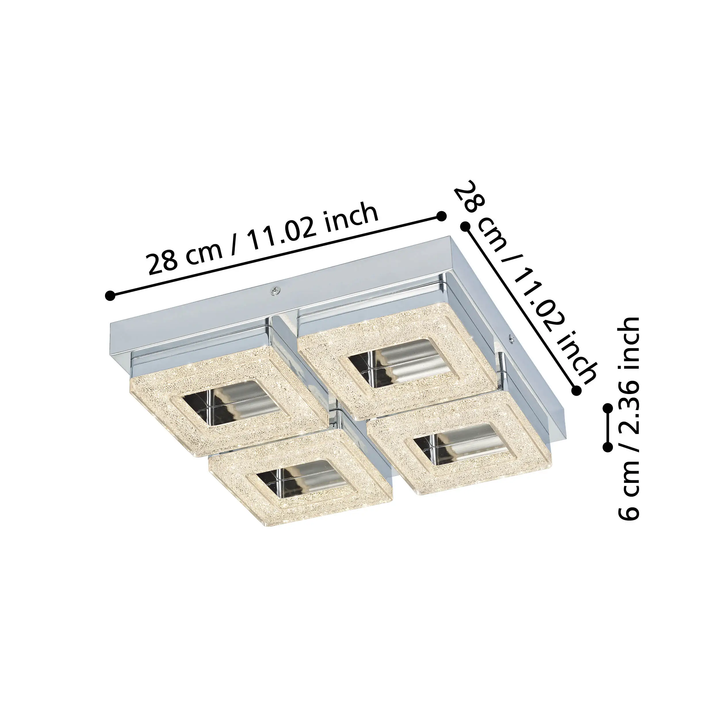 Premium chrome & crystal design – Sleek square chrome-steel body (280×280×60mm) with clear plastic housings containing crystal accents provides a sparkling high-end look.