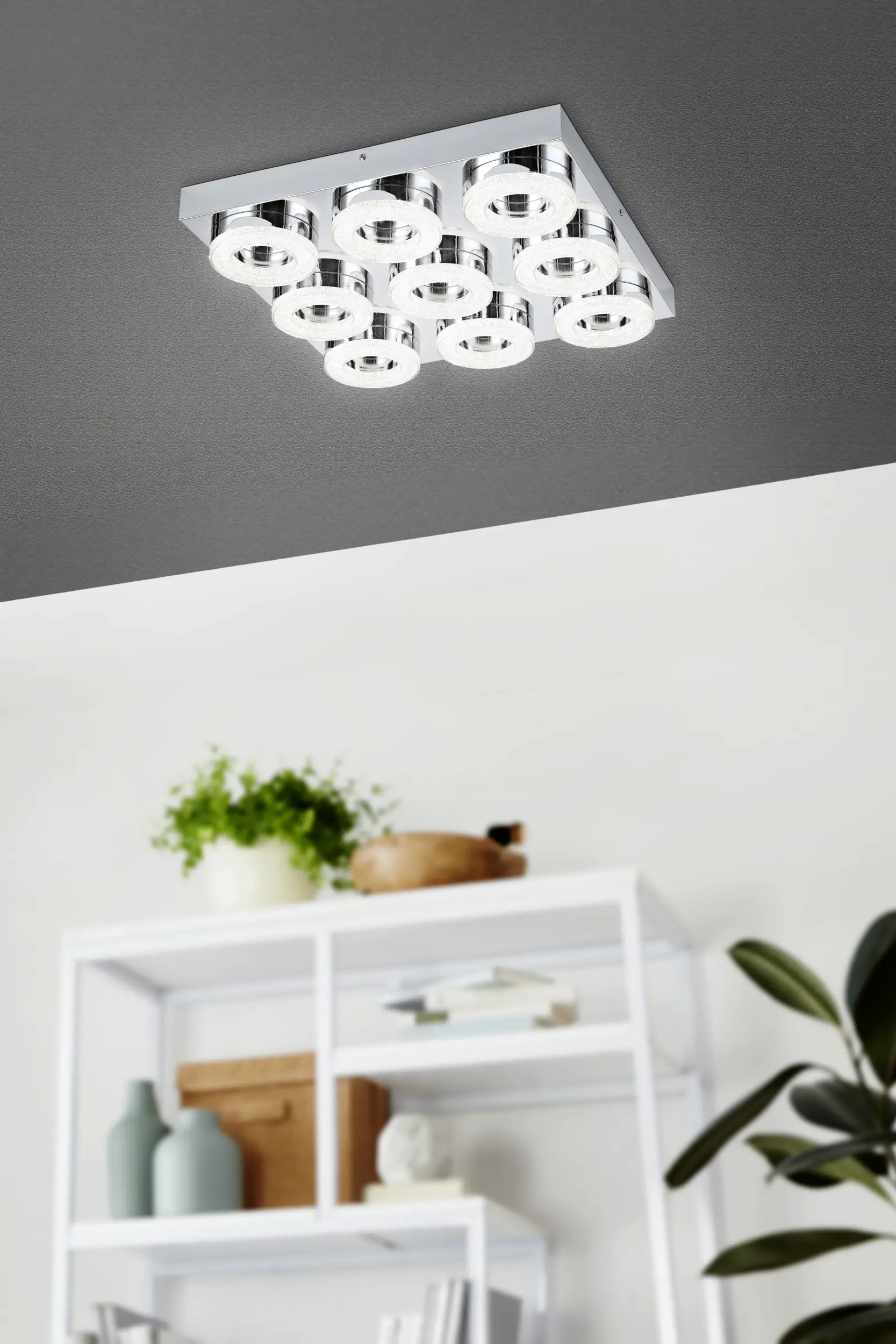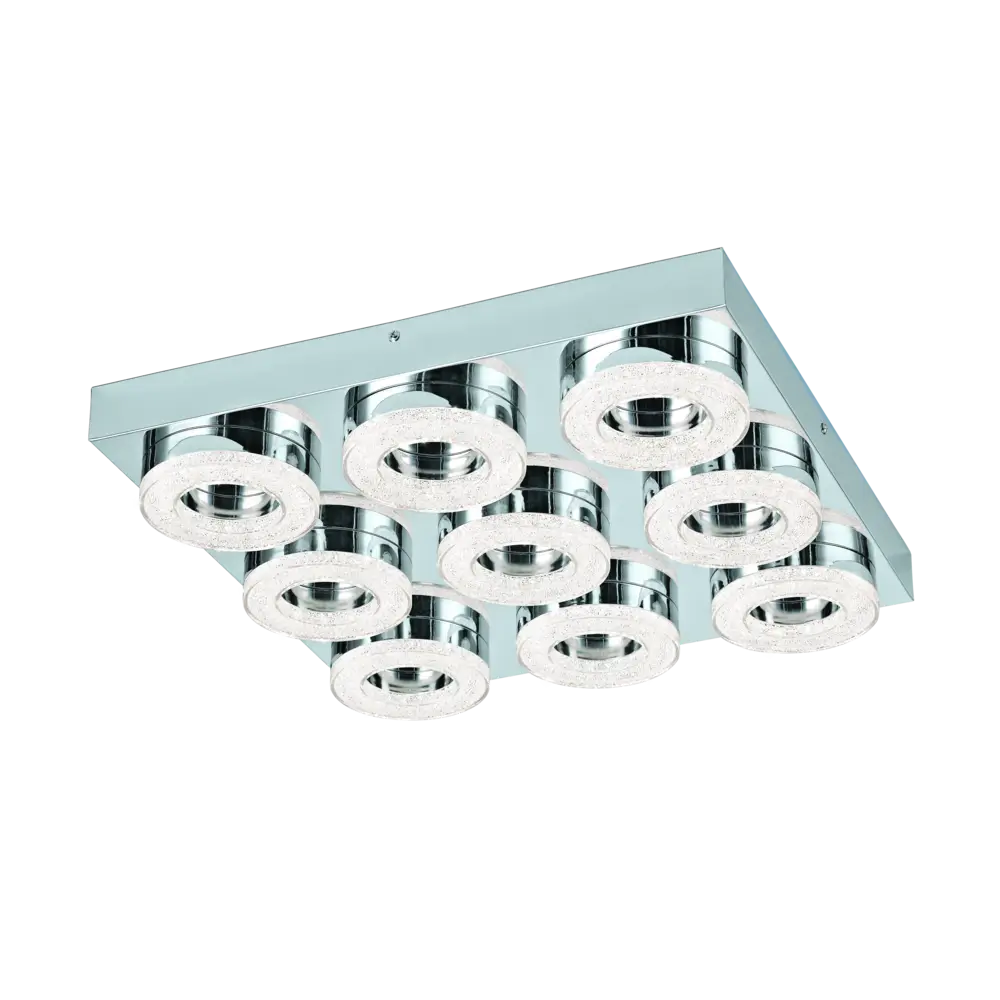 FRADELO LED Ceiling/Wall Lamp – Chrome Steel Housing with Crystal‑Effect Plastic Shades, 9×4W LEDs (3600lm, 3000K Warm White), 440×440×70mm, IP20, ClassII – 5‑Year Warranty.