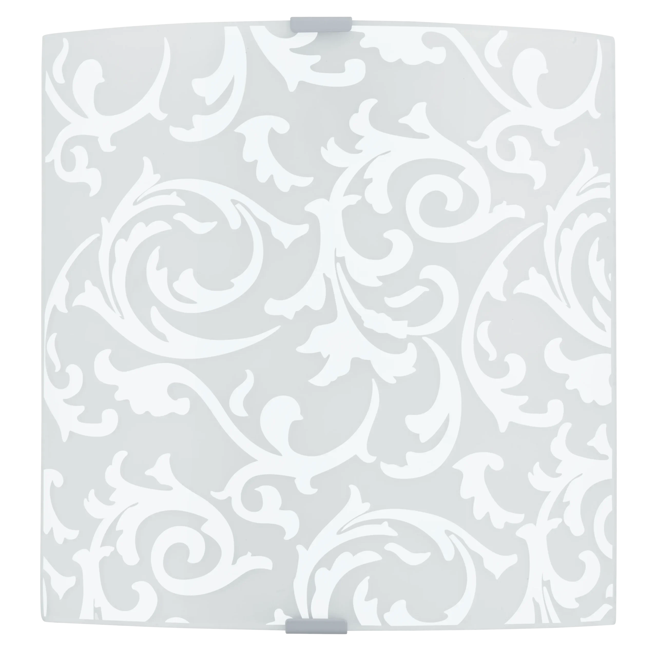 The EGLO GRAFIK 93439 functions as a ceiling lamp with a white/chrome steel frame and a white printed-glass diffuser for clean, uniform illumination in indoor spaces. It includes 1x 7 W GX53 LED (included) producing 550 lm at 3000 K warm white, ideal for everyday ambient lighting in corridors, bedrooms, and living areas. Measuring 280 x 290 mm with 85 mm projection, it features IP20 rating, Class I safety, and operates on 220–240 V for reliable ceiling installation.