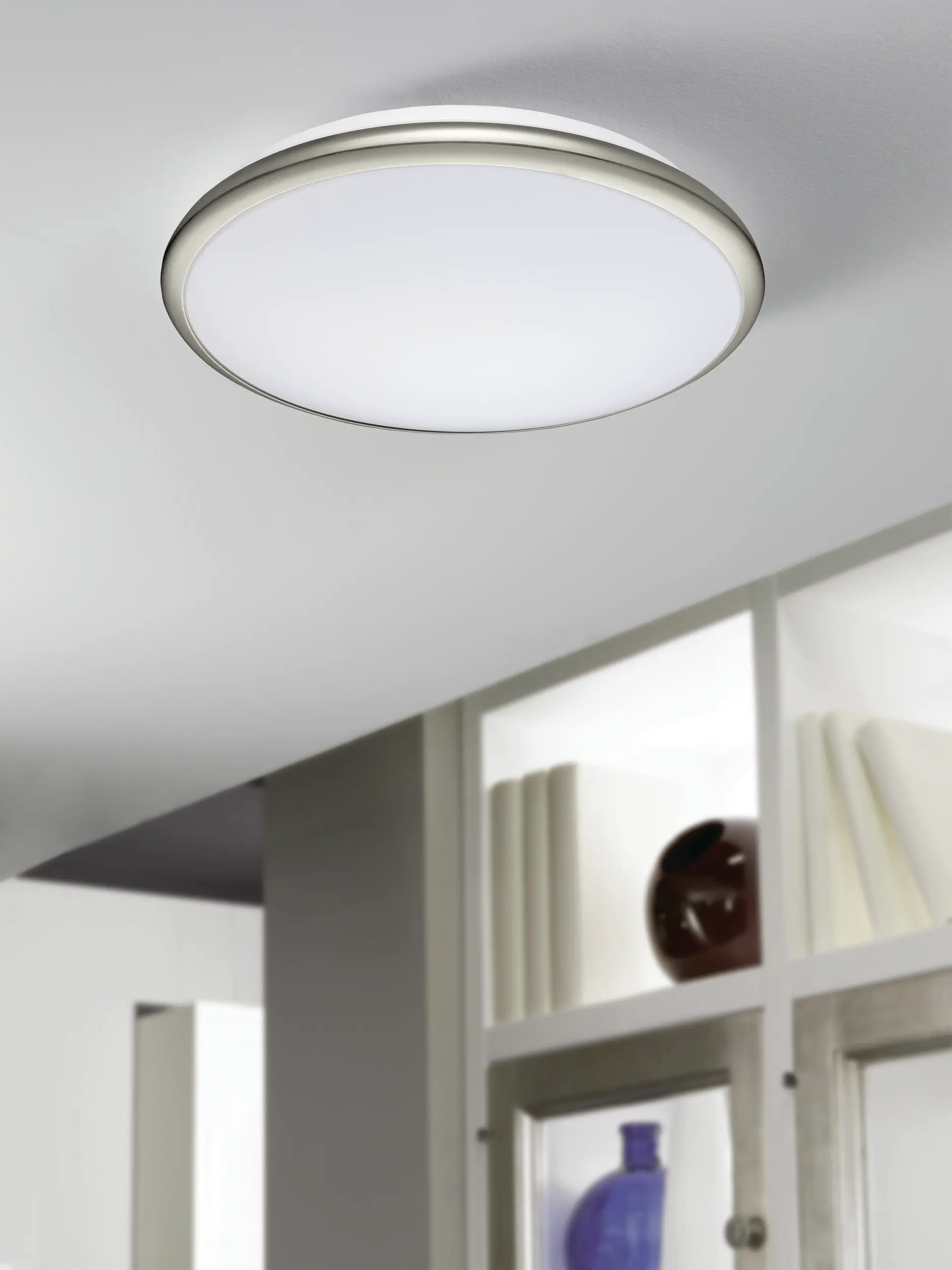 The EGLO MANILVA 93498 is a low-profile ceiling lamp with a satin-nickel steel trim and white plastic diffuser for bright, even illumination in indoor spaces. It includes an 11 W integrated LED (replaceable) outputting 950 lm at 3000 K warm white, non-dimmable, with EEI class E rating for efficient everyday lighting. With a 300 mm diameter and 70 mm height, IP20 rating, and Class I safety on 220–240 V, it offers a reliable, slim ceiling solution.