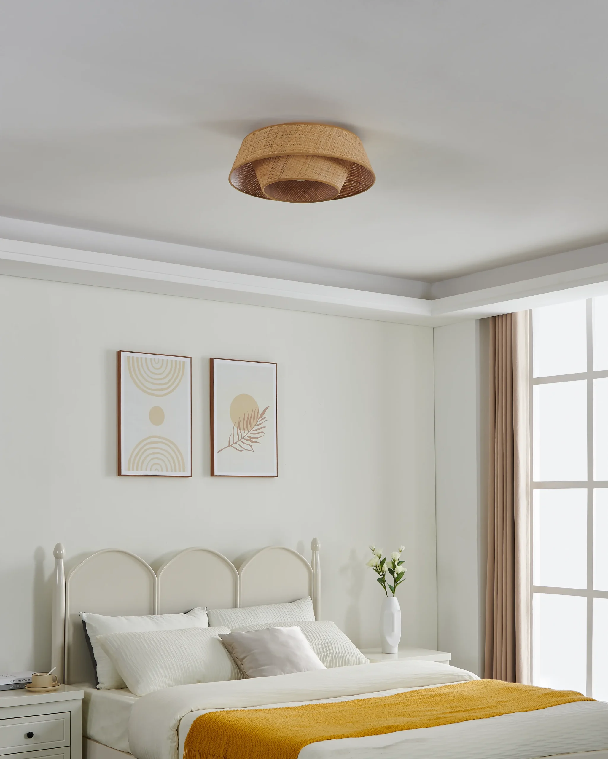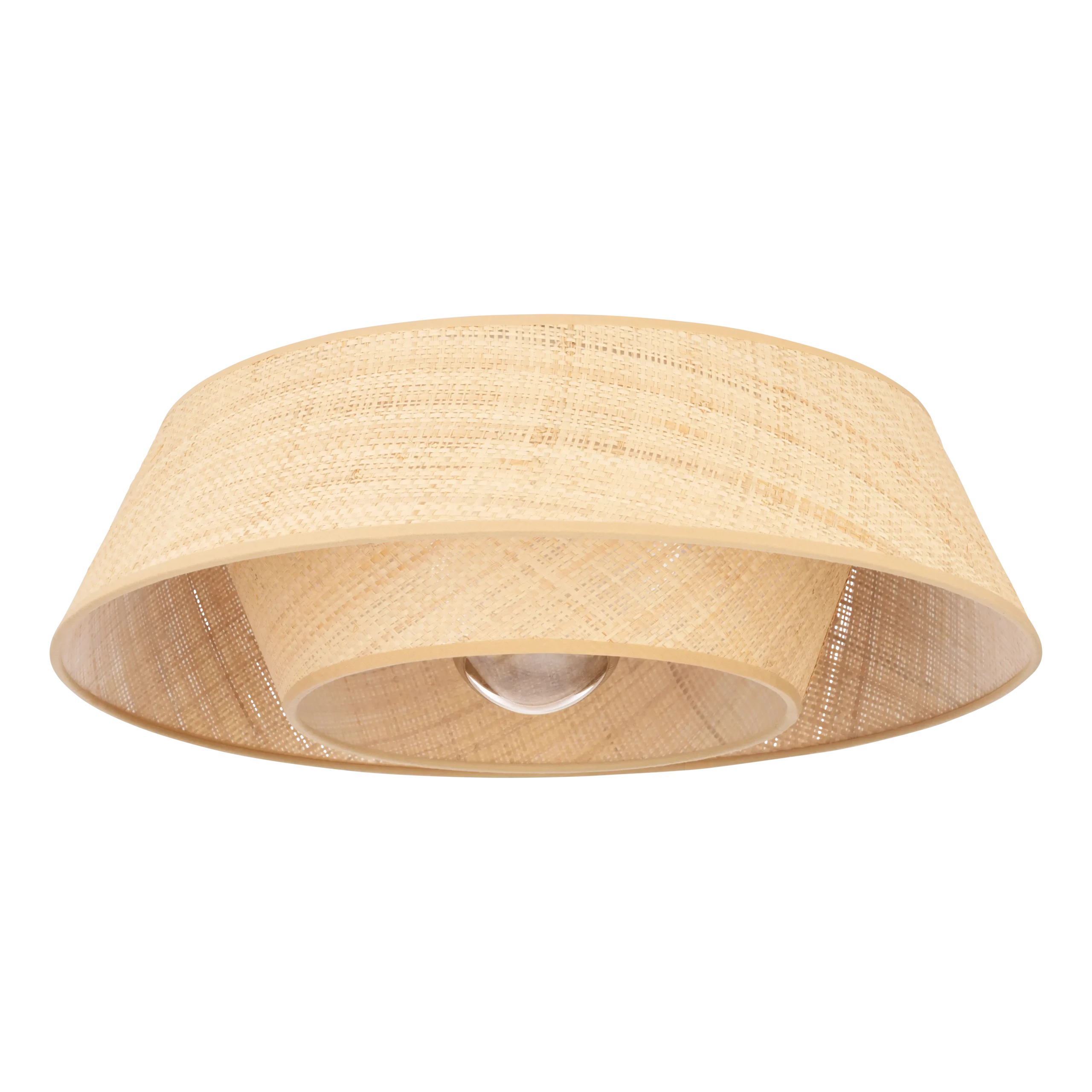 The natural bast shade diffuses light softly, offering a cozy glow ideal for living rooms, bedrooms, entryways, or dining spaces. Its shallow profile makes it great for lower ceilings.