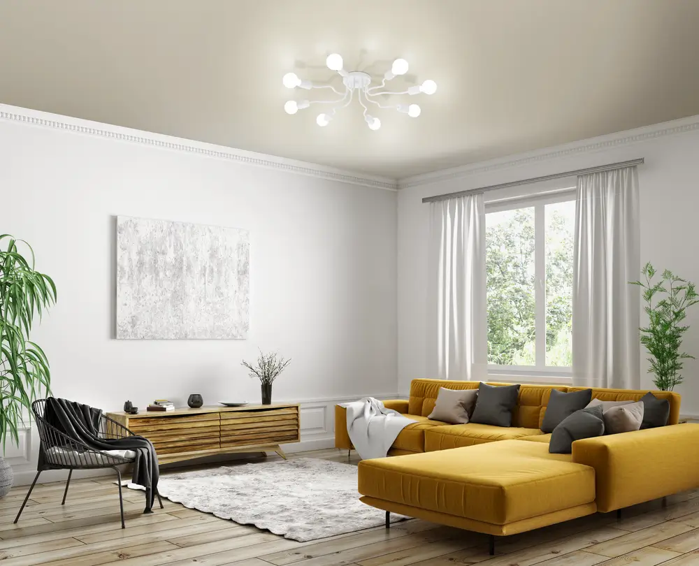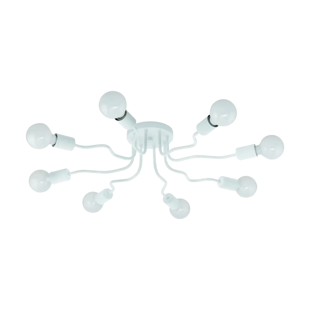 Stylish Multi-Arm White Design – Eye-catching ceiling fixture featuring eight evenly spaced bent Steel arms in matte White, complementing modern interiors from bedrooms to dining rooms.